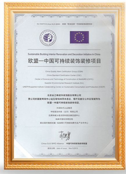 2013年,业之峰为中网装修的区域还获得了“欧盟-中国可持续装饰装修项目”认证,并由此获得中网“特殊贡献奖”。业之峰环保装修的水准已得到国际先进水平的认可。