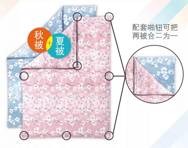 “四季无忧”也是雅芳婷新品研发的匠心设计所在。市面上有很多子母被或组合被,都能四季通用。而雅芳婷的【抑菌魔力四季套被】能够脱颖而出,全凭特殊的纽扣设计。夏被和秋被四周设有啪钮,只需对准位置轻轻一按,即可将两张被子变一张魔力冬被,其保暖性可媲美90%白鹅绒被。这是因为其秋被中应用发热黑科技,比普通被芯更保暖;套被填充物中的天使绒具有出色的保暖性能;夏被和秋被相加产生1+1>2的效果,空气层增加,锁住温暖,防止热量流失。