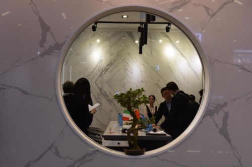 本届博洛尼亚展,中国瓷砖品牌的展厅颇具亮点。诺贝尔瓷砖副总裁周国跃表示,今年诺贝尔展位以黑白灰为主色调,东方禅意的设计形态与画廊式的展示布局,展示了中国品牌的特色。其中,大板瓷抛砖的月洞窗内摆上一株盆景,典型的中式建筑手法传递出中国意象。