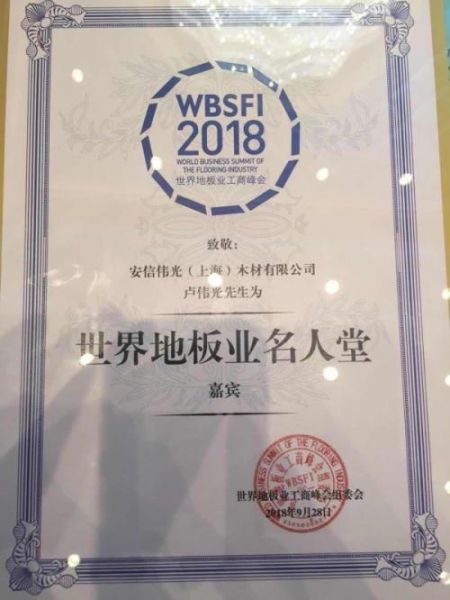 2018世界地板业峰会,安信董事长卢伟光入选名人堂
