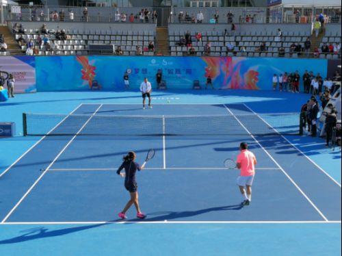 下午15点,国家网球中心布拉德-德拉维球场,来自全球各地的网球迷们已经将球场包围得水泄不通。场地中心,张钧正在与“中国金花”张帅搭档,共同对阵德尔波特罗,上演一场“业余选手VS网坛巨星”的趣味对决。