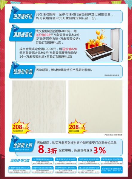 “此次活动涵盖万象品牌的多种品类,包括板材、地板、木门等众多的家居品类。”汤科介绍,活动期间,需要购买板材的消费者在门店签到并登记完整信息,就可以获得万象品牌定制的活动礼品一份;金额满6000元和10000元就能获得对应金额的万象天冠大礼包一份;全场惊爆单品外购物享8.3折优惠,交纳全款后,还能享受折后返现3%。