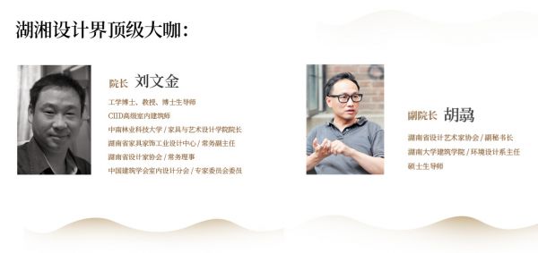 湖南中式设计院由中南林业科技大学家具与艺术设计学院院长、教授、博士生导师刘文金担任院长、湖南省设计艺术家协会副秘书长、湖南大学建筑学院环境设计系主任胡骉担任副院长。同时还有唐亮、毛新华、周斌、刘凌燕等多位湖湘顶尖高端设计师助力加持。设计大咖们相信这不是中国传统文化元素的简单叠加,而是中式元素与现代材质的巧妙兼柔,明相互辉映。