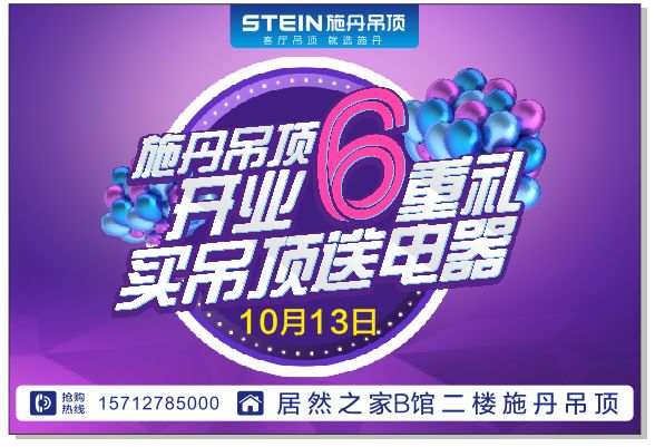 没错,2018年10月13日,施丹吊顶青岛居然之家店将盛装开业,开业当天除了有多重大礼相送,另有厂家签售意想不到的价格优惠,装修的业主朋友这次机会千万千万别错过吆!!