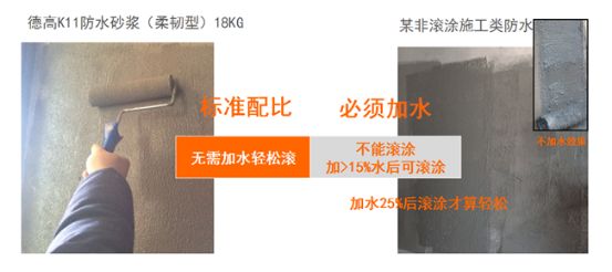 德高K11防水砂浆(柔韧型)实现防水从“毛刷施工”到“滚涂施工”的高效跨越,滚涂施工比刷涂效率高2.5倍,省料20%以上,施工更高效,用量更节省。