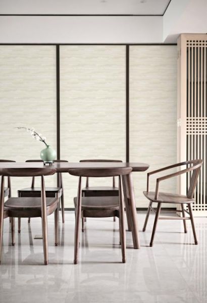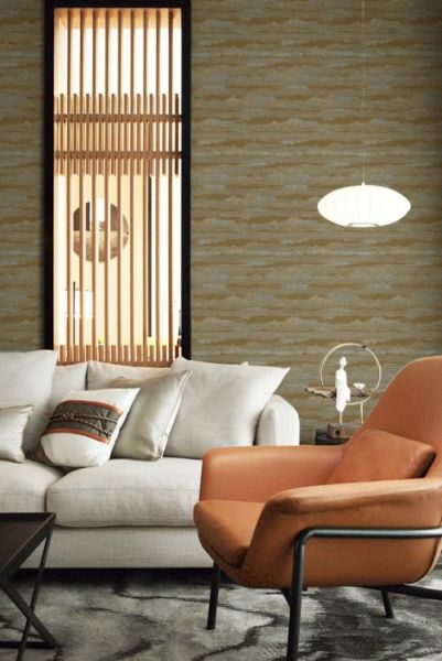 花型设计:提炼了中式经典山水元素,并加以简化和丰富,运用横向纹理的疏密变化和色彩的叠加,去表现中式传统山水晕染手法,将现代的材质、构图与传统元素结合一起,应用于当代家居生活场景。