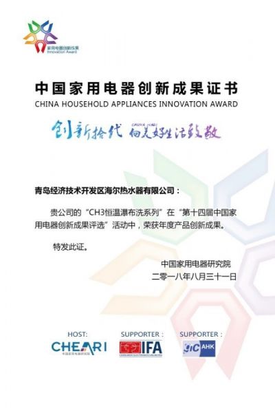 卡萨帝这款新品热水器以恒温瀑布洗带来舒适生活的全面升级,加上首创的创新自净燃科技,主动消除一氧化碳的安全专利技术、完美融合意式风情和美式硬朗的KMI彩晶工艺以及“帛拉蒂”艺术设计,让该产品摘得“年度产品创新成果”奖。