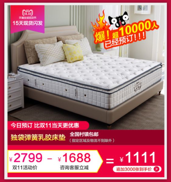 截止,今天15:28,芝华仕床垫在天猫双11活动爆款床垫已经突破10000件,书写了双11预售新纪录,床垫行业新霸主就此延续。