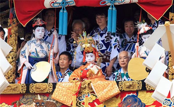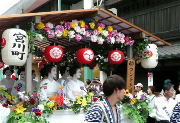 祗园祭的另一场重头戏是艳丽的“花笠巡行”。由撑伞的女子、扮作鹭鸶的孩子、孩童的神轿和舞女等组成,难得一见的艺妓舞妓装扮得美美的坐在花车上巡游,集中展示她们的风采。