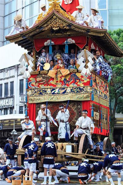 祗园祭的重头戏是人们拽着“山矛”,在主要的街道中举行的“山矛游行”。23座山矛车陆续从四条乌丸出发,完全依靠人力前行,形成壮观的山矛车队。山矛花车被誉为是“移动的美术馆”,四面围以金碧辉煌的织物,呈现出豪华绚丽的装饰效果。人们相信山车和矛车上载有各路神仙,神驾驭着山矛可以汇集各种厄运邪气,并将之祛除。祭典结束之后,用传统方式打造的豪华花车将被全部销毁。人们认为这些设计精美的山矛花车在整个城市中游行,汇集了太多的恶疾,销毁花车是销毁这些恶疾的直接的方式。