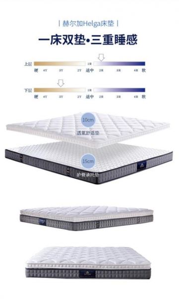 不同于传统床垫的单一功能,Helga赫尔加魔法组合垫一床双垫,可拆卸设计,上层-透氧舒适垫:软硬适中(高度10cm),下层护脊承托垫:硬质护脊(高度15cm),软硬随心,全场景适用,SPA瑜伽、亲子游戏、榻榻米、上下床、高箱床、公寓宿舍、亲密地铺......随搭多用,无限舒享,焕新不一样的梦境。细节上更有边角防撞系统,全新全意,安全呵护。