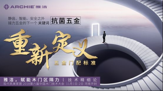 2018年11月1日,雅洁五金作为协办单位参加第六届中国木门技术大会,发表行业“黑科技”,暨静音、智能、安全之后,下一个关键词“抗菌五金”将重新定义五金门配标准,赋予木门不一样的区隔力,敬请期待!
