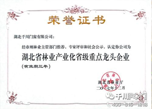千川木门荣获“湖北林业产业化省级重点龙头企业”荣誉称号