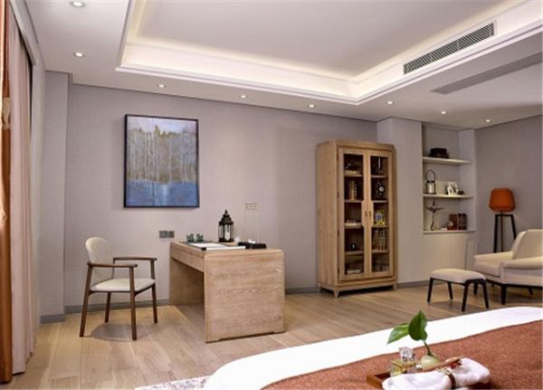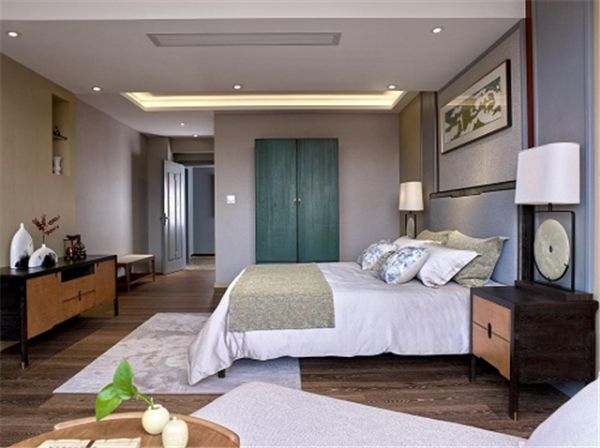 通过对空间结构与比例的细致推敲,借助典雅的色泽、层次的搭配,呈现视觉交织的美感,让每一处设计、每一个环节都绽放其灵魂。当你置身于现代中式营造的空间内,恍惚间你会顿感回到那种安逸宁静的时光,散发一种淡然雅致的味道,那种油然而生的欢喜,让你一眼就喜欢上这种格调。如书架在纵横间碰撞交错,演绎灵动层次之美;书桌造型犹如一个书夹,流线优美利落;书椅设计灵感是来源于圈椅的造型,扶手处好像一个怀抱一样,刚好是手臂放下来最舒适的高度,显得自然贴心。衣柜柜门采用墨绿色设计,使得生动感跃然而出;流苏的拉手造型优美,而流苏在日常生活中一般用于头饰或者裙摆上,这样可以体现女主人温婉的气质。