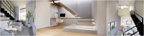 通往顶层的楼梯下部则采用家具道具化的设计手法,长长的办公桌可以放台式电脑同时也是楼梯的一部分。