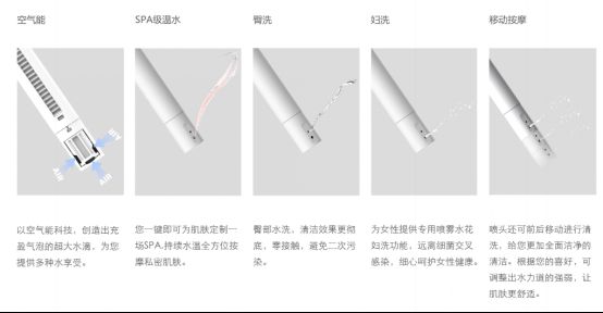 这款产品采用All in water技术,以空气能科技,创造出充盈气泡的超大水滴,为您提供多种水享受,可以一键为肌肤定制一场SPA,持续水温全方位按摩私密肌肤。
