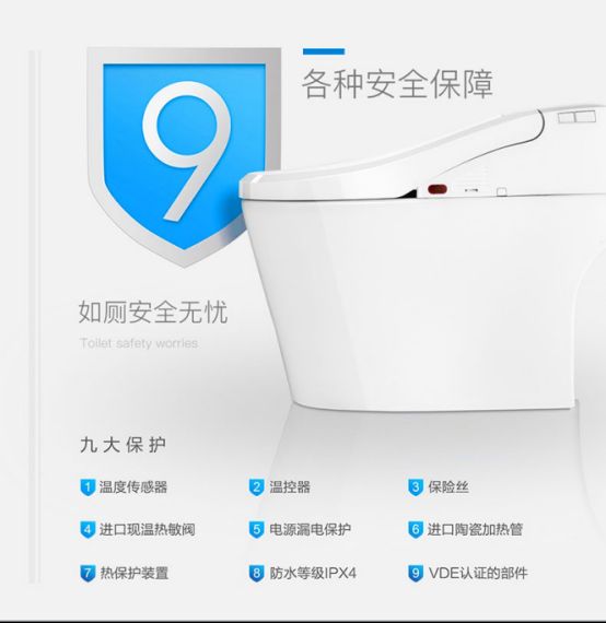 设计上采用9大安全防护体系,防烫防漏电。独特的进口限温热敏阀,进水口水温高时,关闭阀门,保证直接接触人体的水温不超过53摄氏度,座圈采用低温防烫伤保护,十分钟后自动降温,防止老人与小孩低温烫伤,贴心又安全。