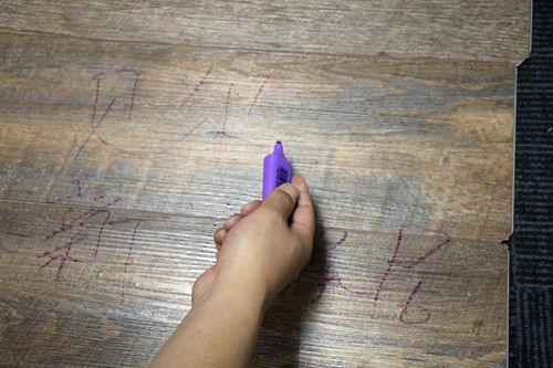 挑选地板也要考虑到小朋友喜欢在地板上乱涂乱画、油污及颜料等洒在地板上的生活场景。评测人员用小朋友最爱的水彩笔在地板上涂画,静置几分钟等字迹干去,再用沾了水的纸巾简单擦拭,就能光洁如新,十分方便。
