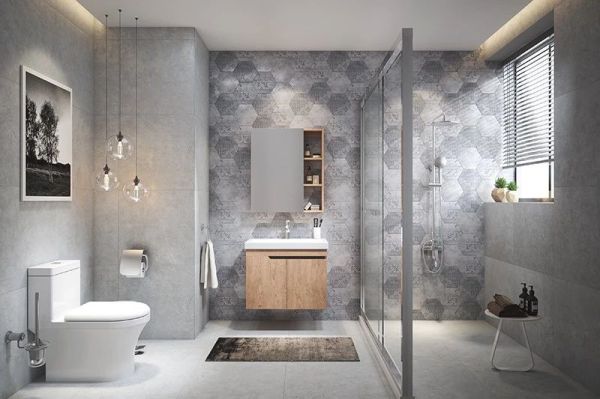 东鹏LOFT CITY 空间采用原木色调浴室柜,朴素原始的木纹,清新自然,成为雾霾灰工业风空间的点睛之笔,让空间柔和而充满生命力。