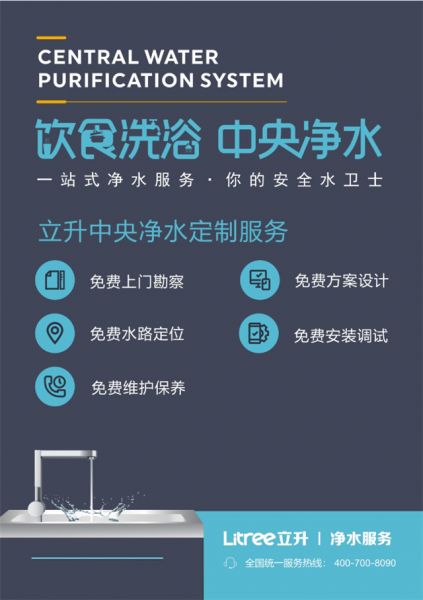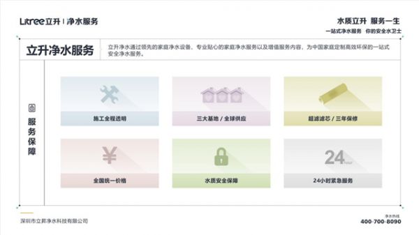 作为国内净水行业的领导者,立升是最早推出全屋中央净水解决方案的厂商之一。立升净水从1998年进入家用净水市场时,就提出了“饮食洗浴,中央净水”的家庭全方位净水理念,并为广大的消费者带来了一整套的全屋中央净水解决方案。立升净水也是行业内首家率先提出“净水服务”概念的净水品牌,率先提出“水质立升 服务一生”的净水服务理念,并为净水用户提供6大净水保障。