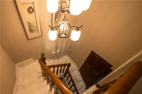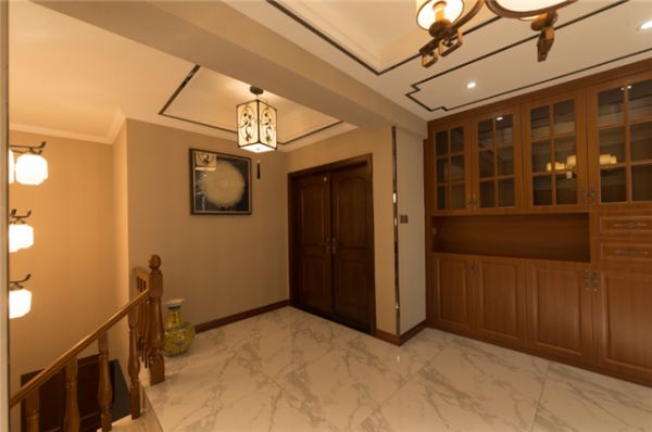 楼梯上,继续采用大理石瓷砖及实木栏杆的材质搭配,让空间视觉和质感整体与一致。富有中式水墨意蕴的艺术挂画,延伸了楼道的上下空间,也带来了视野的丰富性及趣味性。