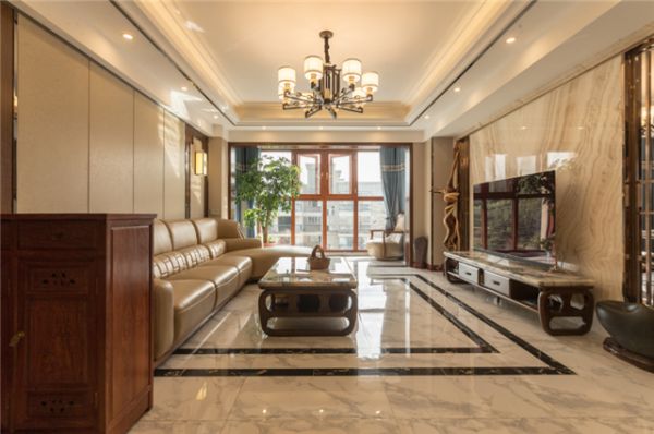 地砖上采用波导线装饰,能够增加空间的平衡和对称感,带来古典的气息。在家具的选择上,既拥有非常舒适、百搭的现代简约沙发,也增设了简约圆润的实木家具,两者视觉冲突较弱,让空间柔和、舒缓。