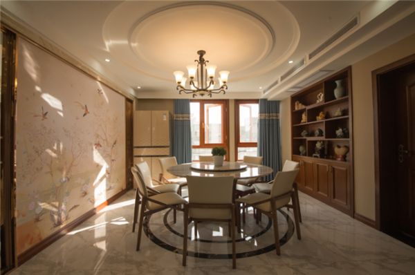 斑驳的午后阳光,为餐厅带来了别致的光效。博古架式储物柜收纳功能强大,更能摆放出业主的珍爱收藏,瞬间提升家居的文化气息,传递出主人博雅与志趣。