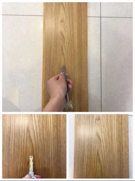 作为精致女孩的小编来说,高跟鞋是必备的。如果地板质量欠佳,长期的高跟鞋踩踏会造成地板表面漆膜脱落或者凹凸不平的表面也会严重影响家庭环境的美观度。因此作为破坏王的小编都拿尖锐的钥匙来考验一下这款地板,小编用了十分的力气在地板上来回划完之后发现,竟然一点痕迹都没有,可见这款地板的耐磨性能非常的卓越。