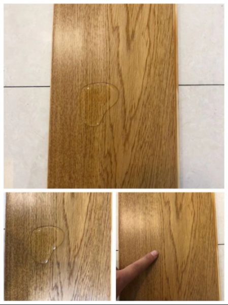 湿胀干缩是木材天然的属性,因此季节的交替或者日常生活中地面积水易造成地板起拱或者缝隙过大等问题。接下来我们来看看这款地板的防水能力如何?小编把水倒在地板上,经过十几分钟的放置,并未发现水渍有扩散,小编将水擦干,也没有发现渗透,轻轻一擦,还是它最初的样子。足见,此款地板不仅好打理,防水性能也很棒。