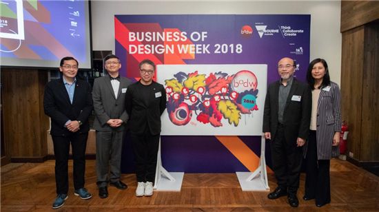 (左起) 香港设计中心行政总裁利德裕博士、澳洲维多利亚州政府首席代表-香港区郭品智先生、香港设计中心主席严志明教授JP、设计营商周督导委员会主席罗仲荣先生,以及香港贸易发展局服务业拓展总监古静敏女士为活动进行启动仪式。