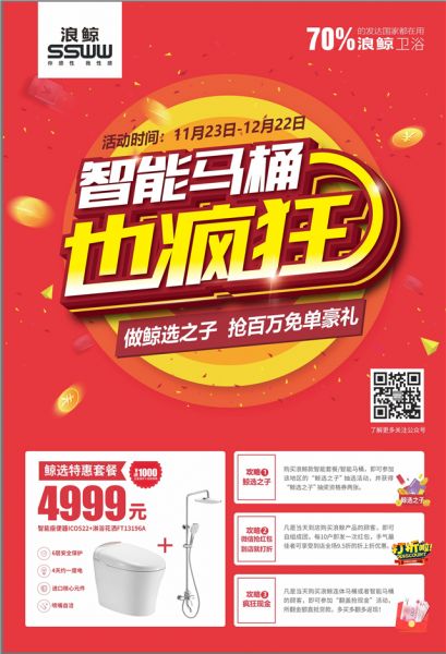 立冬过后,冬季来临,全国范围内纷纷出现了不同程度的降温,浪鲸卫浴照顾用户的如厕感受,在11月23日至12月22日隆重推出“智能马桶也疯狂——做鲸选之子 抢百万智能豪礼”全国联促活动,即使寒冬,浪鲸也始终陪伴相守,让您温暖如初。