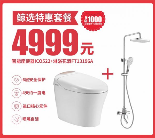 活动期间,推出ICO522智能座便器和淋浴花洒FT13196A组合鲸选特惠套餐,仅售4999元,买就送1000元五金挂件抵用券。温暖座圈及舒适的智能座便器搭配双重洗浴体验的淋浴花洒,惊喜钜惠,物超所值。