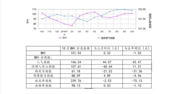 据国家统计局数据显示,10月房地产开发景气指数(简称「国房景气指数」)为101.94,比9月份回落0.05点。