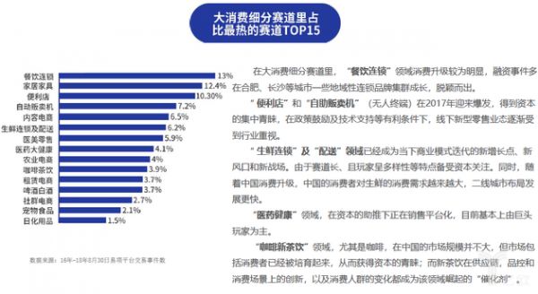报告显示,2016年至2018年8月,便利店行业总计融资事件发生次数达190次,在大消费领域融资事件发生总数中占比达10.3%,在大消费领域最热门投资赛道排行榜中居于第三位。
