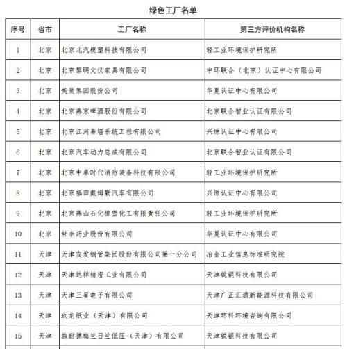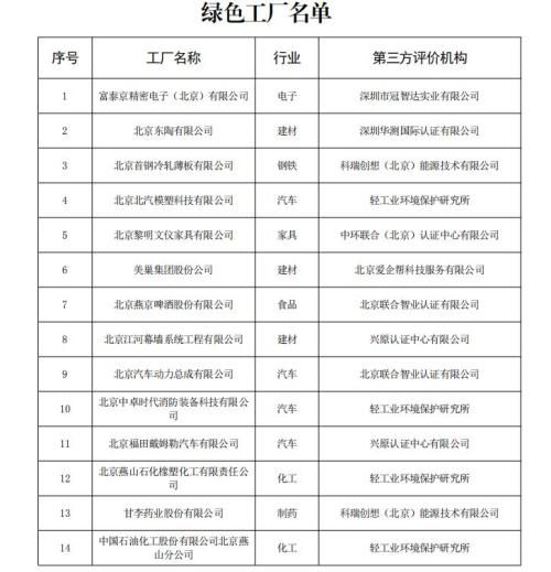 北京市绿色工厂名单