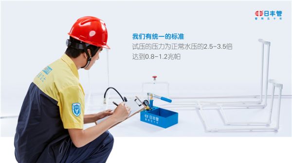 水电装修属于隐蔽工程,一旦施工完毕,就很难鉴定安装质量。特别是冷热水管,由于是嵌入墙体安装,回填管路后,后期无法及时发现问题。 所以水管安装完毕后进行试压验收就显得尤为重要。作为国内管道行业的领跑者,日丰集团致力于提供给消费者一个完善的服务体系。在其他管道品牌试水试压服务还不够完善之际,我们率先推出了日丰安全卫士服务,并承诺为通过日丰安全卫士验收的管路系统提供“双质保”,给消费者一个安全无忧的管道系统。