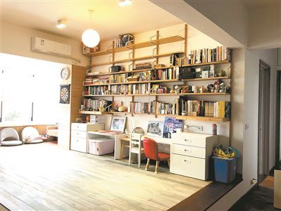即便家里有四间房,也还是有人希望将书房变成更开放的空间。徐女士近期购买了一套二手房,原先一共有四个房间,近客厅是一间小书房。但徐女士向往有一个既可以跟朋友自由谈天说地,又可以让女儿玩耍,甚至有朋友来,扔一个垫子加一床被子就能休息的空间,而且为了让客厅看起来更开阔,徐女士干脆将书房两边墙体打掉,垫起一个地台铺上木地板,变成开放的和式空间。原先书房与卧室之间的墙壁保留,做了一大面书架,将自己的藏书全部放上去。地台上则放置小茶几、小凳子,还有大量靠垫,平时既可以把笔记本电脑摆在小茶几上工作,也可以与朋友聚会时席地而坐或者围绕茶几躺着聊天吃东西,不必拘束。