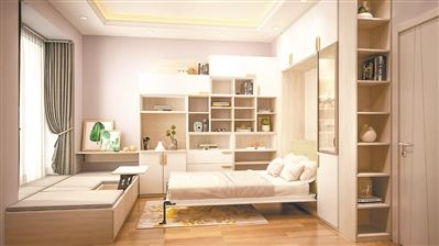 如果业主想在客厅或者卧室延伸出一个家用办公区域,设计师认为可以考虑订制可折叠的书桌,打开时可作为餐桌或书桌,也可以作为梳妆台,零碎物品可以放到抽屉里。而将书房变身多功能房,业主可以使用立翻床的设计,配合折叠移动桌,或者在榻榻米上安装一个升降台面,平时可以只用折叠桌或升降台放置笔记本电脑工作。当亲朋好友过来小住时,晚间业主只需将立翻床往下一拉,让书房立马成客房。白天可将床收入柜中,柜子的其他地方用来作为全家的收纳空间,家庭成员就可以把书房当作休闲区域或者孩子们的游戏室来使用。