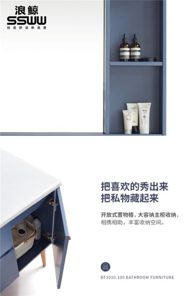 分区收纳是浴室柜在精美外观下的重要功能,不仅给琐碎繁多的浴室杂物提供一个安身之处,也处处提醒我们共同相处的哲学之道。浪鲸“蓝色爱人”浴室柜采用镜柜、抽屉、侧柜三重收纳,不管是纸巾毛巾,还是沐浴露护肤品等洗浴工具,均可安心放置在不同收纳分区。懂得把生活杂物收藏起来是一种习惯,在同一屋檐下生活,懂得收纳小脾气和小情绪,是一种相处哲学。