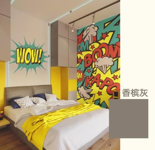 居家空间讲究的就是轻松自在,于是在家居配置上采用了大量灰色,能让人在空间中沉淀下来。灰色组装吊柜,被分成不同大小的柜体,一是为了方便储存不同尺寸的杂物;二是缓解视觉上的乏味。但不想卧室的柜体沉闷,于是香槟灰吊柜撞色麻面黄背板,让房间所点缀的色彩流动起来,典雅中透露个性。