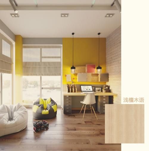 仿佛沐浴在温暖阳光下的麻面黄作墙板,在透过窗投射的阳光下,抢眼而令人过目不忘。在樱花草黄的基础上,色度偏浅的板材更能体现出活力。艾高家居的“浅檀木语”的木头纹路,给空间带来大自然氛围,让工作环境远离冷冰冰的钢铁和现代材料的千篇一律,同时给环境带来温润的“木气”。