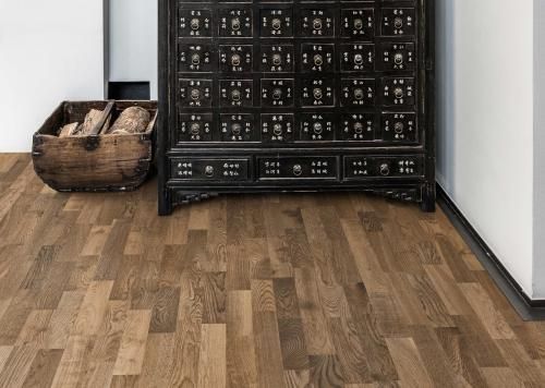 得高瑞典Kahrs流明系列三拼大地色橡木,采用"超级哑光漆"工艺处理,烟熏色设计将大地色的温暖色调凸显,三拼设计将温馨自然流露。每一片地板都进行了精心的拉绒处理,表面更接近真实纹理,赋予地板自然深邃的观感,冬季的家中带来更多的生命力。