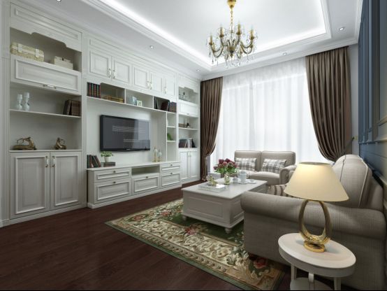 随后,步入客厅空间。与整面墙体合二为一的电视柜,以英式的宫廷线条演绎出居家的尊崇感。再搭配上复古的水晶吊灯,更显出整个客厅的精致品味。搭配掌上明珠家居英伦风简约款式的沙发,空间的实用与美观并存,让住客在惬意的环境里,享受居家生活的美好与恬静。