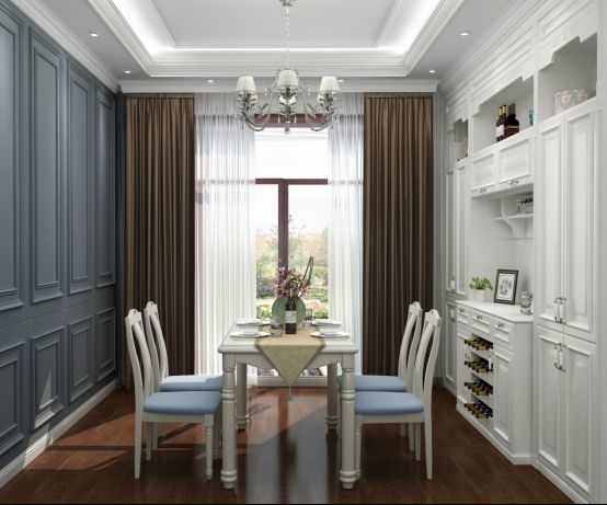 最后,是合家欢聚的餐厅。掌上明珠家居英伦情怀套间大胆采用一面灰蓝、一面纯白的撞色对比,在色彩的跳跃中自然烘托出温馨热闹的就餐氛围。餐边柜+酒架的组合定制柜设计,在彰显主人不凡品味的同时,也大大提升了餐厅的储物能力。试想在一个阳光明媚的下午,从酒架上取下一瓶珍藏好酒与友人共享,餐厅里酒香四溢,处处是欢声笑语,那画面真是美不胜收。