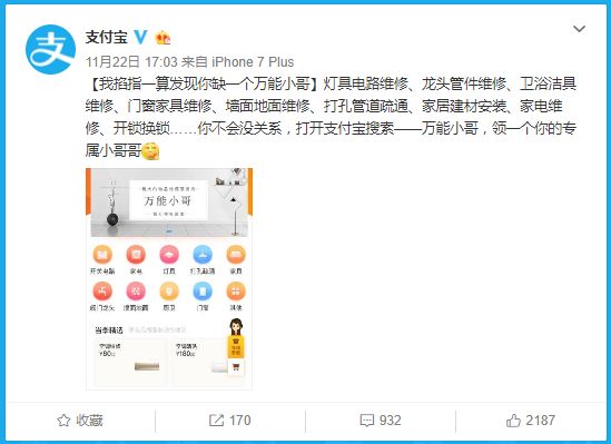 最近,支付宝官微发布了一条微博,这条微博和大家分享了一个支付宝最近上线的小程序——万能小哥!万能小哥是一个互联网上门维修平台,这条消息的公布不仅引起了广大网友的关注,甚至还有网友猜测,阿里是否在布局家居后市场服务行业!