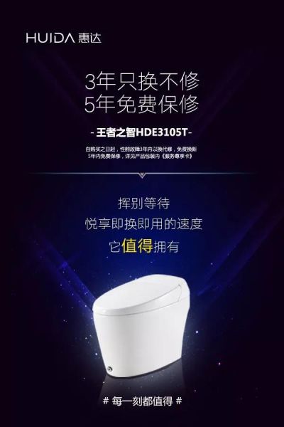 近日,随着惠达卫浴新款智能马桶HDE3105T的上市,惠达全新推出的“3年以换代修,免费换新,5年免费保修”智能马桶售后服务也正式亮相。作为民族卫浴品牌的代表,惠达卫浴在行业内率先提出智能马桶“以换代修”的售后服务,再次以颠覆性的壮举,重新定义了智能马桶的售后服务标准,彻底解决了消费者购买智能马桶产品的“后顾之忧”。