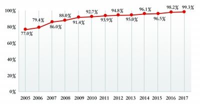 ▲2005年-2017年北京市城镇居民家庭节水型用水器具普及率。
