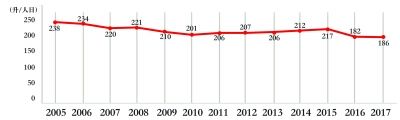 ▲2005年-2017年北京市大生活用水量走势图,城市大生活用水量包括公共服务及居民家庭用水。