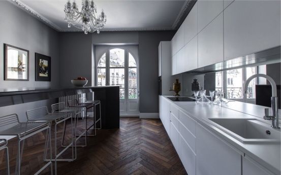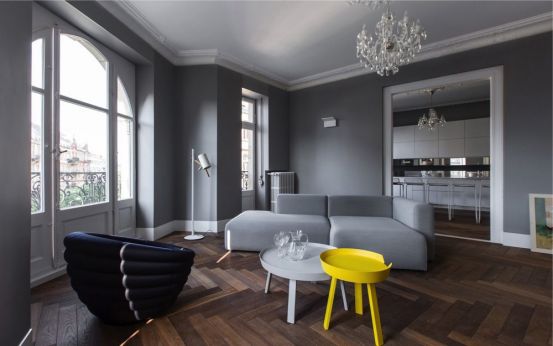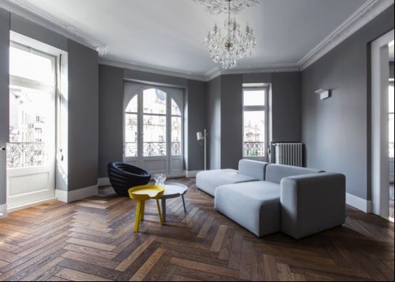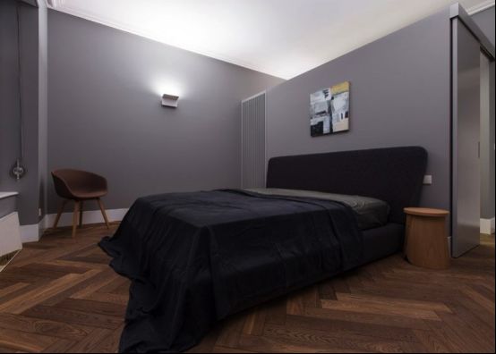 公寓内的墙面都是统一的雅灰色,低调内敛。全屋铺装的施兰祖人字拼地板明暗交替,曲回婉转,规整利落的V字形兼具一种理性的稳定和感性的迂回,因为比顺铺加倍了木条间的对比,使木材深浅不一的颜色和自然纹理拼接出一幅光影斑驳,相映成辉的地面艺术,形成一种错综微妙的情绪。同时因为避免了直接形成尖角,所以施兰祖人字拼在气质上较鱼骨拼更兼容折中些。