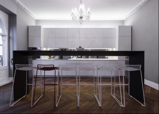 厨房中最引人注目的要属中间的黑色吧台,搭配高脚凳,还可以作为餐桌使用。与客厅同款的欧式圆形拱门是整个厨房光线的来源之处,从这扇门出去就是精致的走廊,直通客厅外面的阳台。